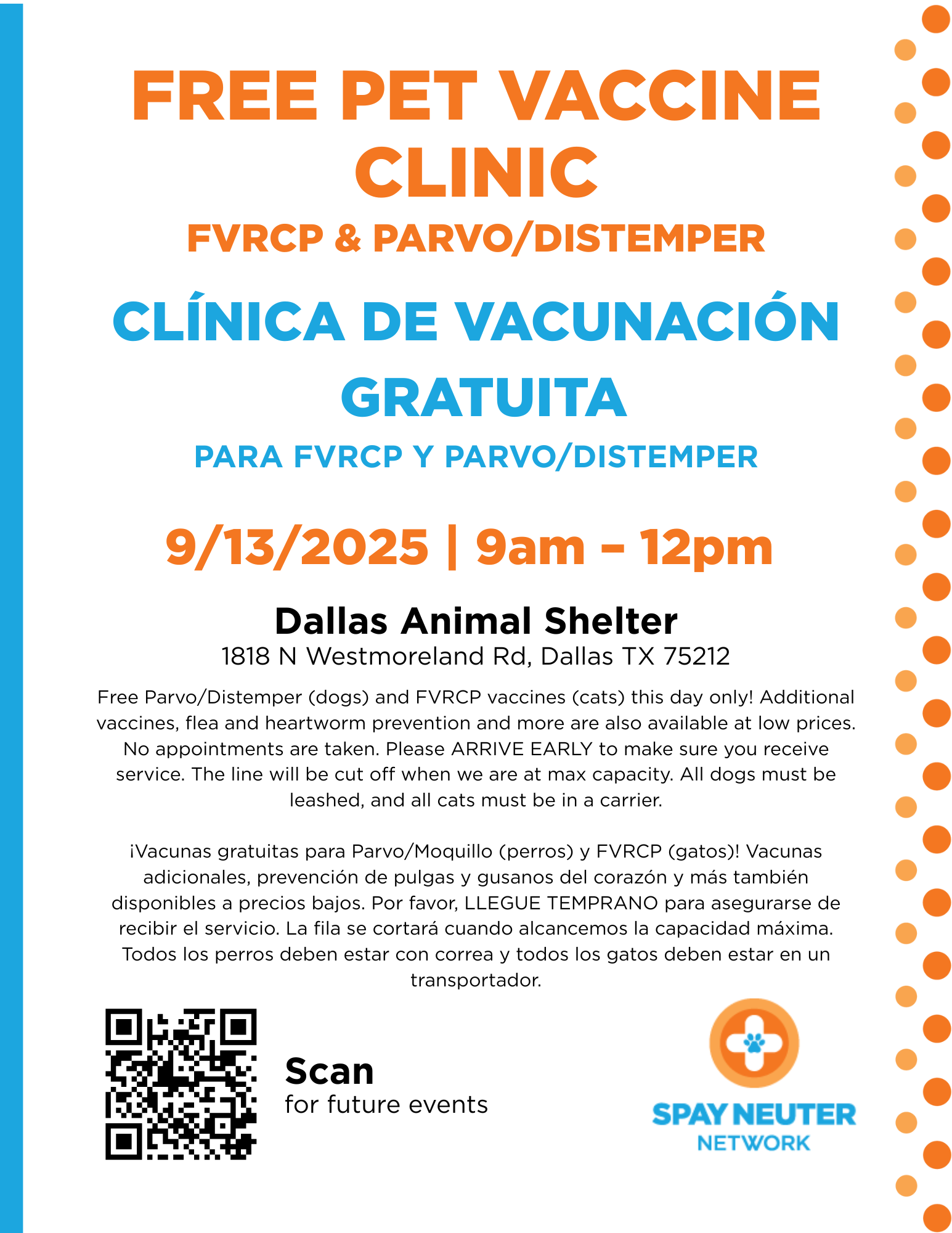 ¡Vacunas gratuitas contra la Rabia, Parvo/Moquillo (perros) y FVRCP (gatos)! Vacunas adicionales, prevención de pulgas y gusanos del corazón y más también disponibles a precios bajos. Por favor, LLEGUE TEMPRANO para asegurarse de recibir el servicio. La fila se cortará cuando alcancemos la capacidad máxima. Todos los perros deben estar con correa y todos los gatos deben estar en un