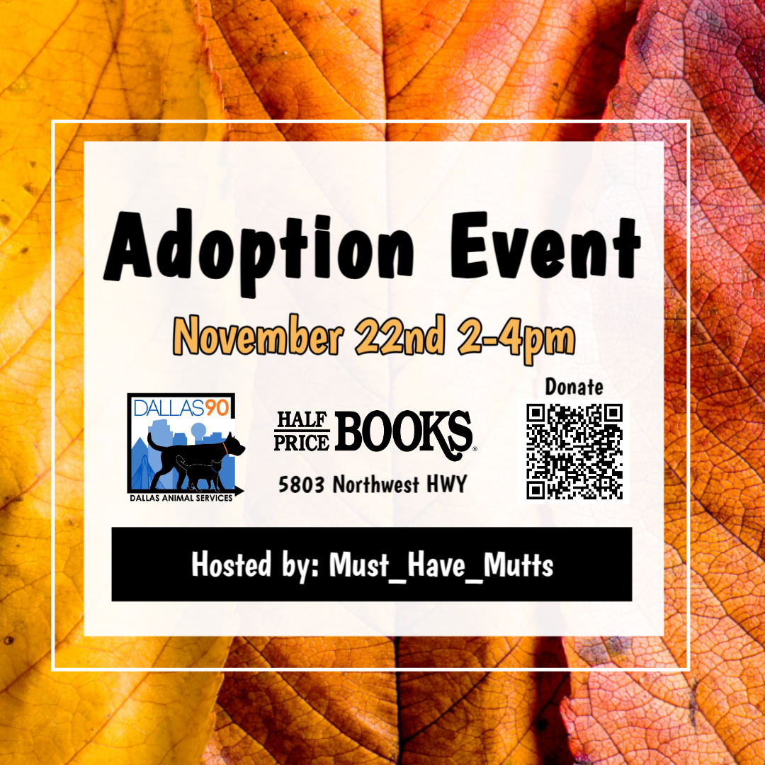 Half Price Books Adoption Event Come meet DAS adoptable pets! + Add to Google Calendar + iCal / Outlook export 00 days 00 hours 00 minutes 00 seconds Date Nov 22 2025 Time 2:00 pm - 4:00 pm Location Half Price Books 5803 E NW Hwy, Dallas, TX 75231 Category Adoptions Share this event