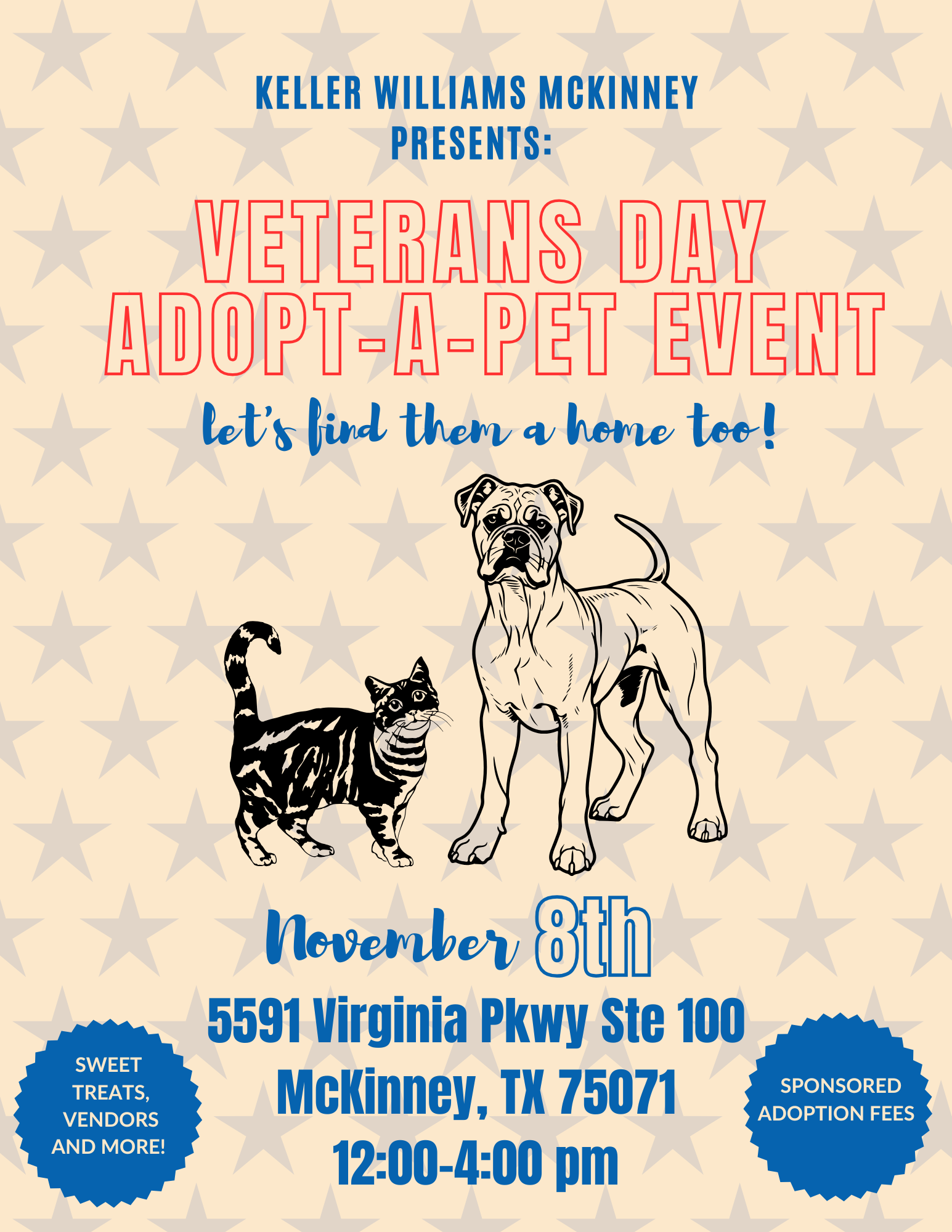 Keller Williams Reality Veterans Day Adoption Event Keller Williams Reality Veterans Day Adoption Event + Add to Google Calendar + iCal / Outlook export 00 days 00 hours 00 minutes 00 seconds Date Nov 08 2025 Time 12:00 pm - 4:00 pm Location Keller Williams 7200 W University Dr, McKinney, TX 75071-6652, United States Category Adoptions Share this event