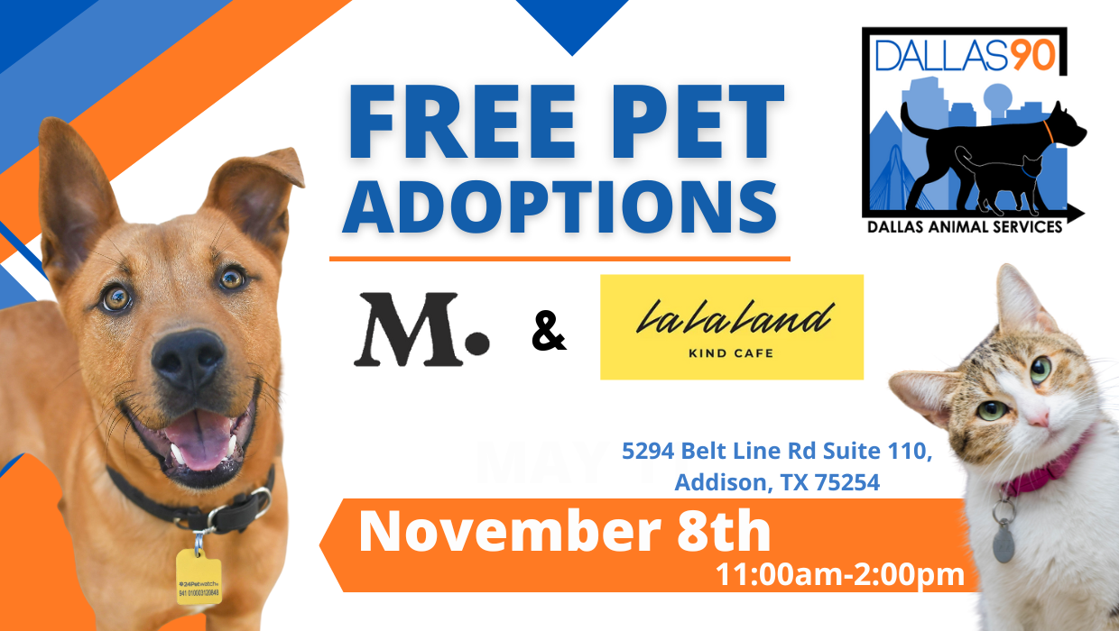 Modern Animal & La La Land Adoption Event DAS Adoption Event + Add to Google Calendar + iCal / Outlook export 00 days 00 hours 00 minutes 00 seconds Date Nov 08 2025 Time 11:00 am - 2:00 pm Location La La Land Cafe 5959 Royal Ln, #635A, Dallas TX 75230 Category Adoptions Share this event