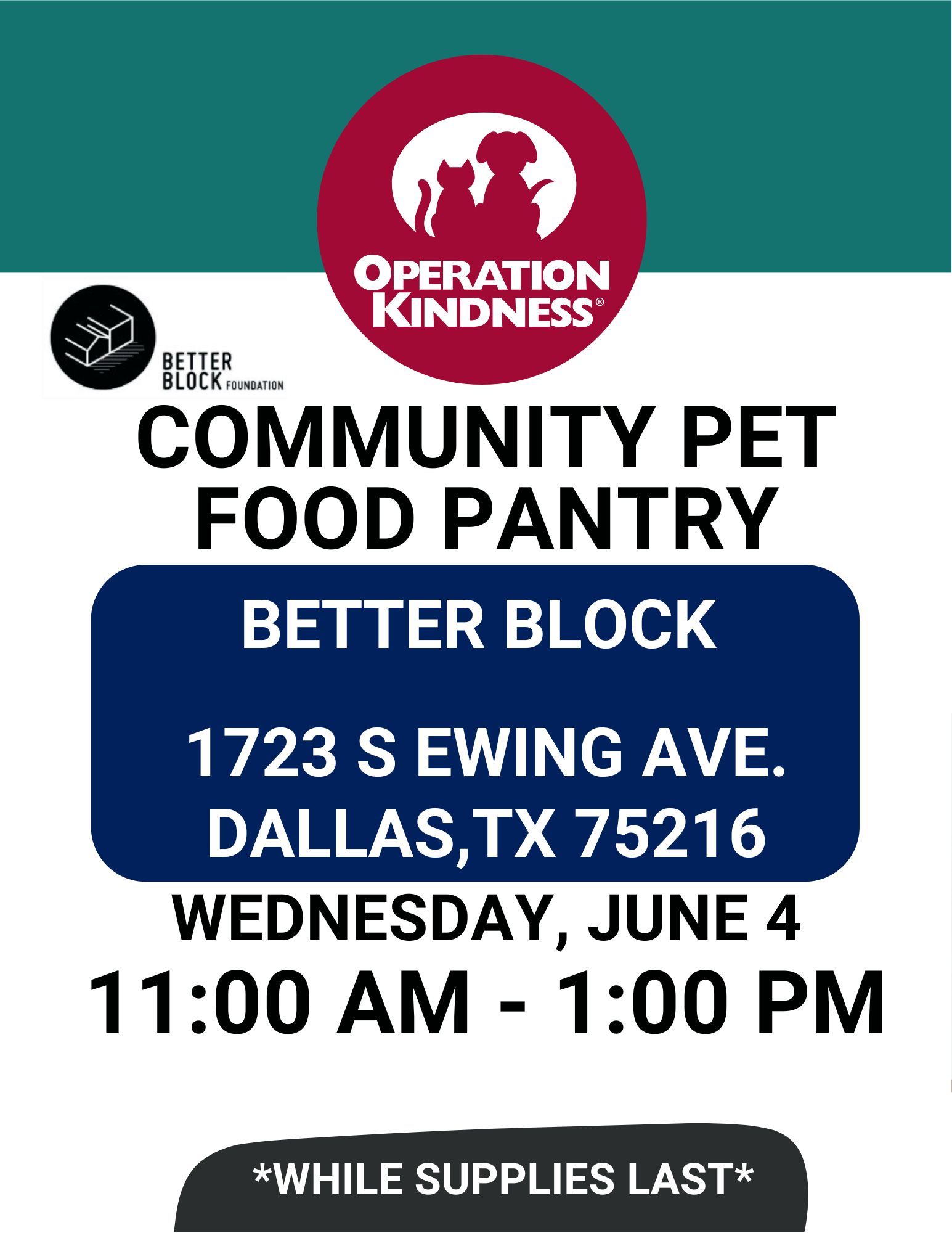 Next Wednesday, June 4 from 11am to 1pm, the Operation Kindness Community Pet Food Pantry will be at Better Block Foundation (1723 S. Ewing Ave).