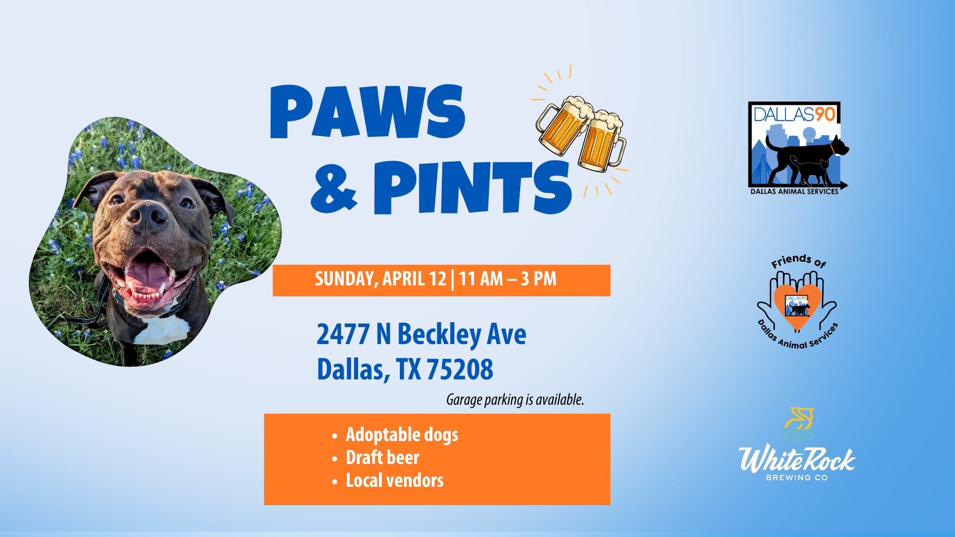 (CANCELLED) Paws & Pints EVENT CANCELLED DUE TO PREDICTED WEATHER Join us for a paws-itively fun afternoon at Paws + Add to Google Calendar + iCal / Outlook export The event is finished. Date Apr 12 2026 Expired! Time 11:00 am - 3:00 pm Location White Rock Brewing Co. 2477 N Beckley Ave Dallas, TX 75208 Category Adoptions Share this event