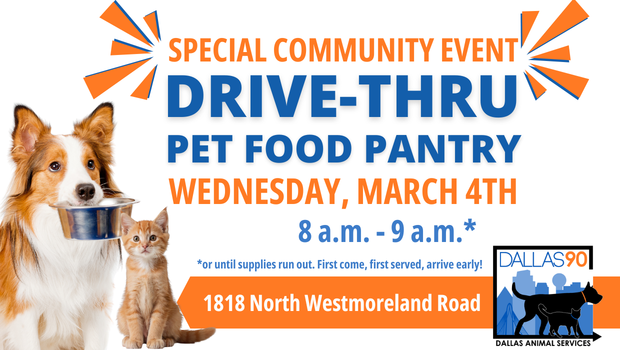 This Wednesday, March 4, from 8:00–9:00 a.m., Dallas Animal Services** will distribute pet food to pet owners in need at 1818 North Westmoreland Road.**